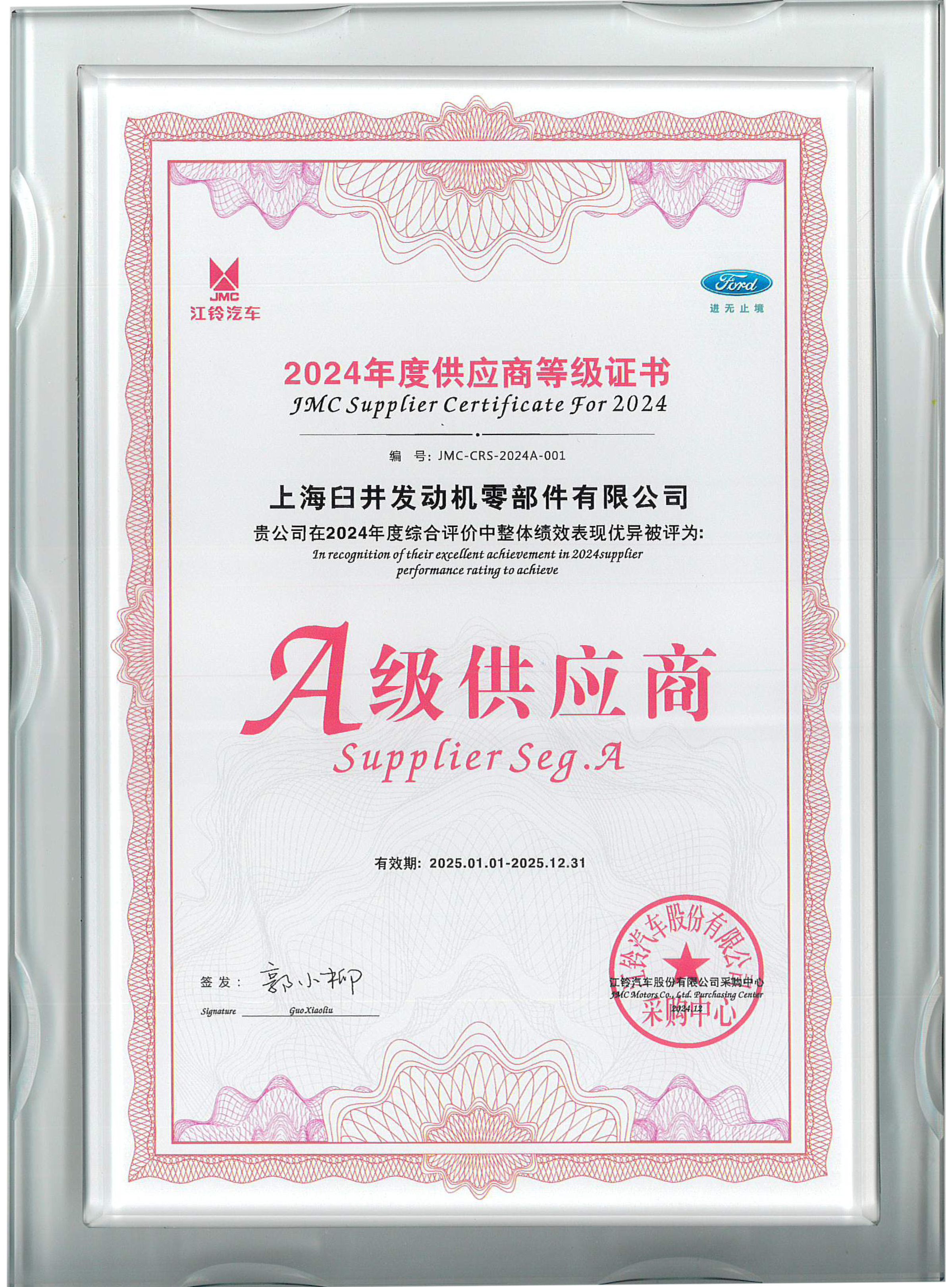 江鈴汽車(chē)授予 上海臼井公司"2024年度供應(yīng)商等級(jí)"證書(shū),評(píng)為“A級(jí)供應(yīng)商”。